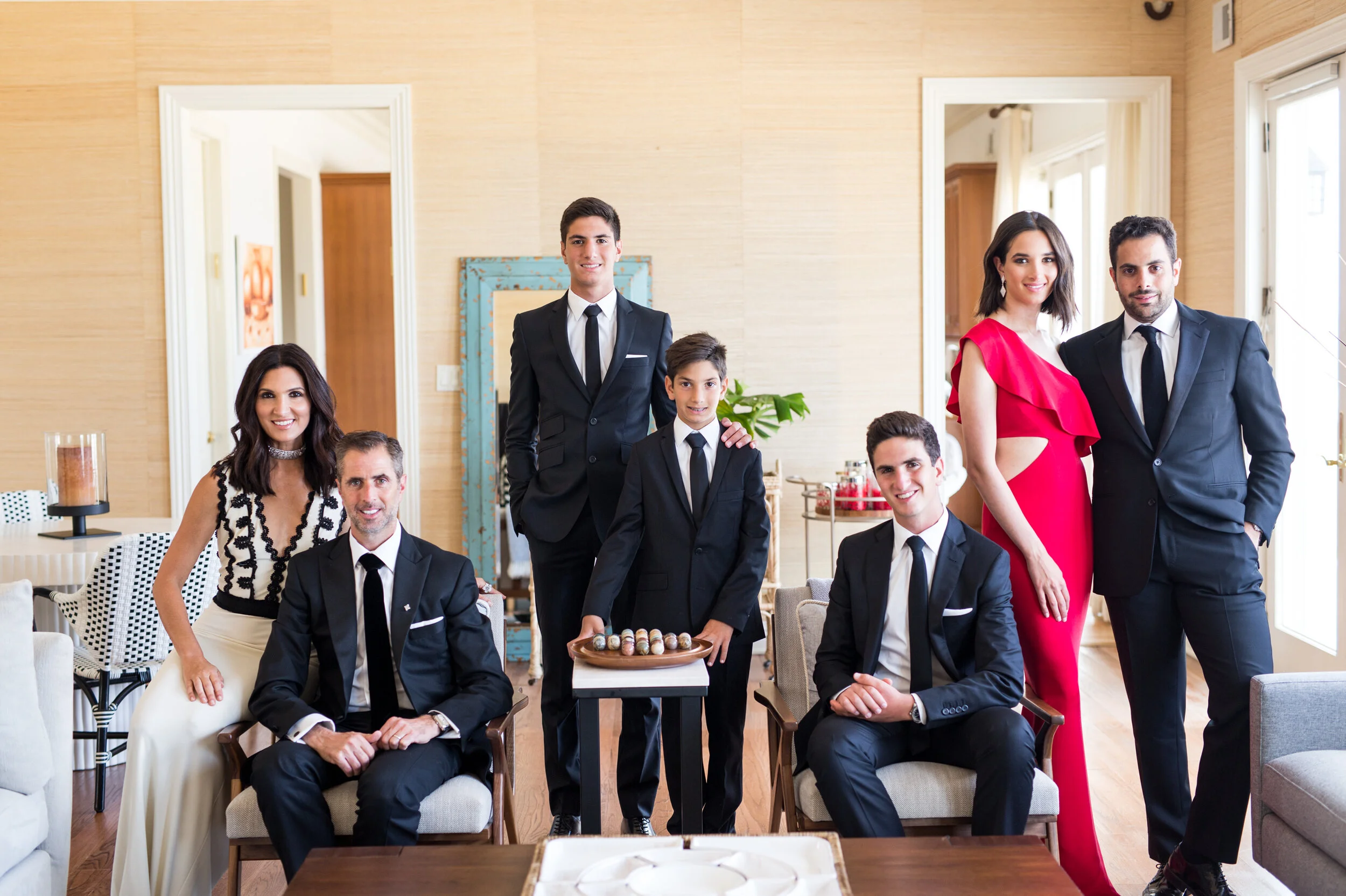 The living room is a great space for getting creative with posing. Where the bedroom makes for laid back loungewear, the living room is the space for utilizing the furniture and really bringing out your family’s sense of expression. If your living room is super modern, you can glam out.